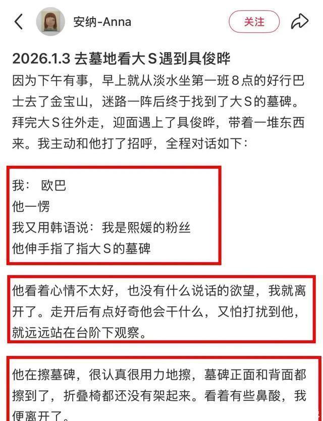 大S离世时,外界对具俊晔有误解,不少网友质疑他演戏。 时间如梭,大S离世快了一周年,这些声音渐渐消失,具俊晔只是一个中年丧妻的可怜男人。 粉丝前几日去大S墓地探望,偶遇了具俊晔。