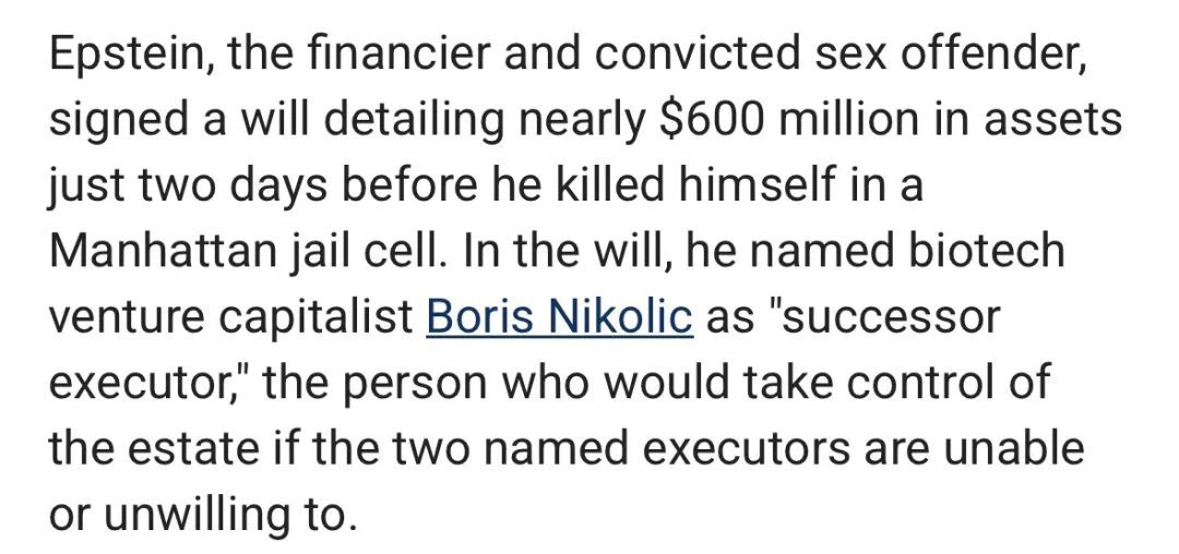 2019年,爱泼斯坦在自杀前两天签署了一份遗嘱,详细列出了近六亿美元的资产。遗嘱中,他指定了两位遗嘱执行人,并指定鲍里斯做“继任遗嘱执行人”,既如果两位指定的遗嘱执行人无法或者不愿意履行职责的话,就由鲍里斯来处理他的遗产。