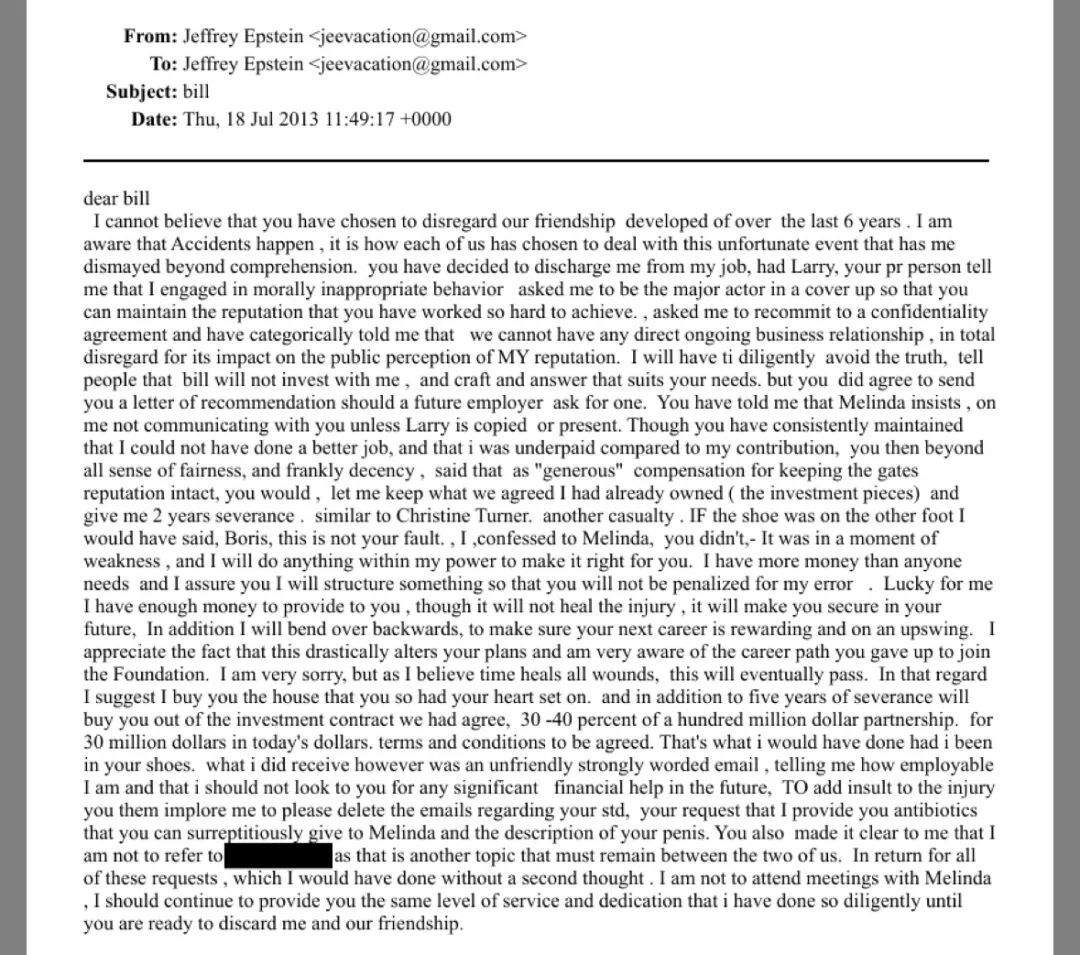 内容是鲍里斯写给盖茨的口吻,看上去是鲍里斯犯了什么严重错误,盖茨要撤销他的职务,爱泼斯坦就帮他写了这封先恳求后威胁的信。